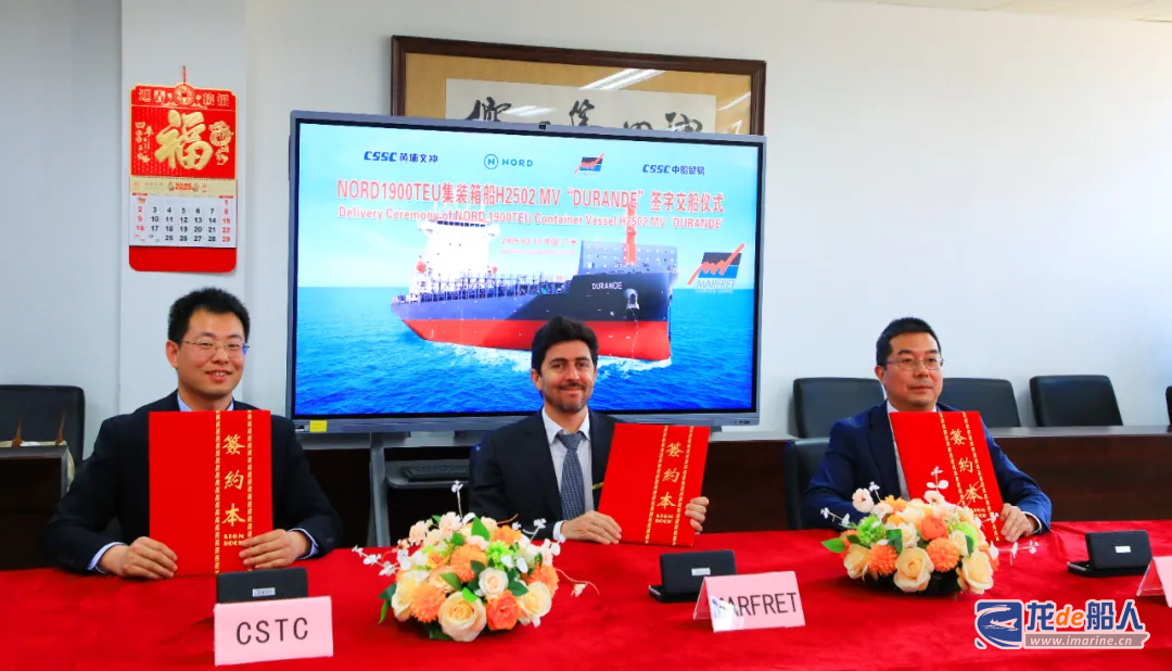 3月19日,中船集团黄埔文冲为德国NORD集团公司建造的1900TEU系列 3#船H2502船举行命名及交船仪式,该船交付较合同期提前103天,被命名为”DURANDE”轮。