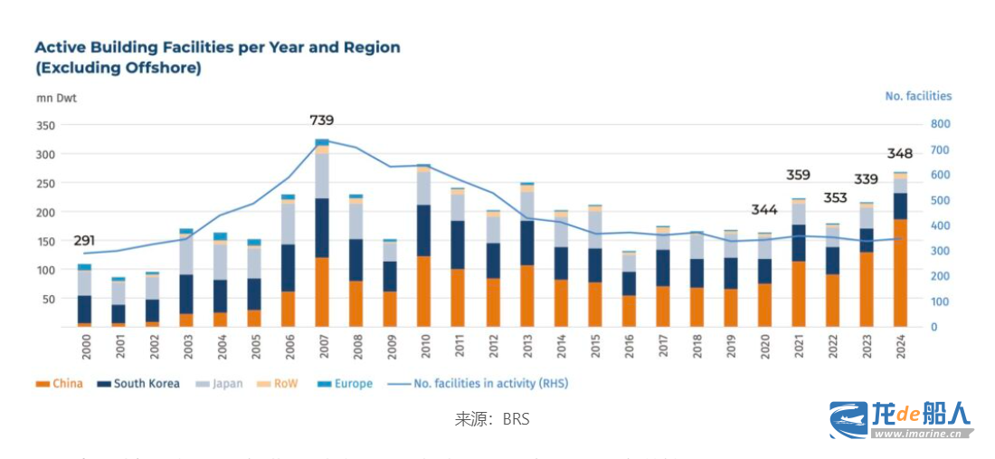 BRS预计,中国船厂完成扩张后,预计每年将为全球造船产能新增约200艘船舶,意味着全球造船产能将从现有的1500艘增加至约1700艘。该机构数据显示,目前全球约有348家在运营船厂,这一数值大约是2007年造船高峰期约700家活跃船厂的50%。