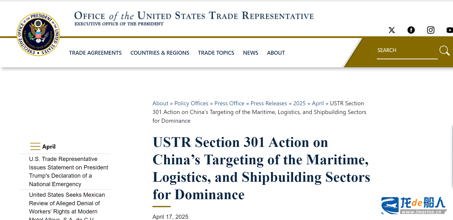 美国时间4月17日,美国贸易代表办公室(USTR)宣布针对“中国海事、物流和造船行业主导地位”进行301调查后的具体限制和收费措施。收费将从2025年10月14日开始。