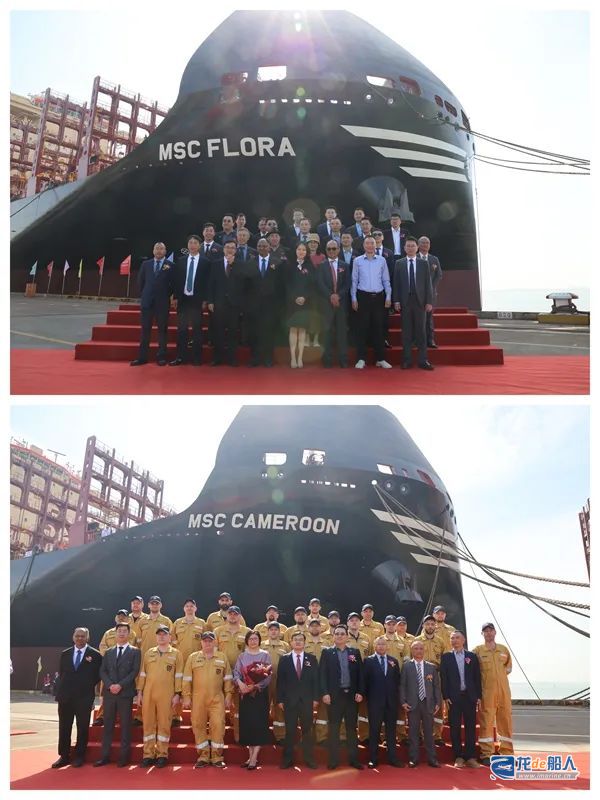 4月16日上午,新时代造船举行船舶命名仪式,1#11400箱、3#&9#8100箱LNG双燃料动力集装箱船被分别命名为“MSC FLORA”、“MSC CAMEROON”、“MSC NAMIBIA”号。