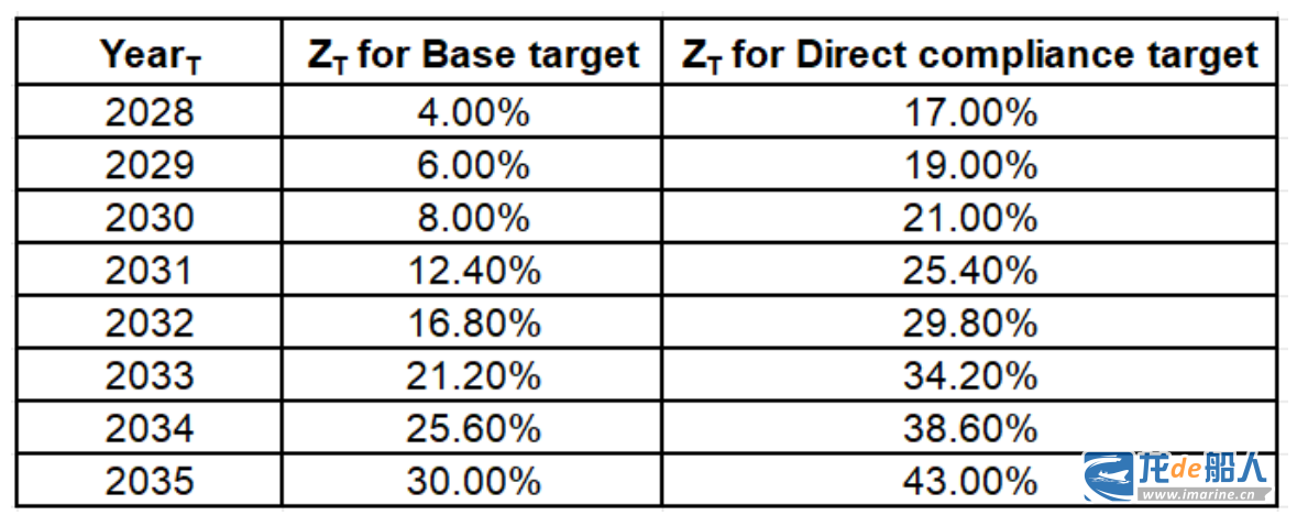 2030年基础目标为8%,直接合规目标为21%,2035年基础目标为30%,直接合规目标为43%。2036 年至2040年的GFI目标应在2032年1月1日前确定,且2040年的基础目标应为相对基准减排65%。