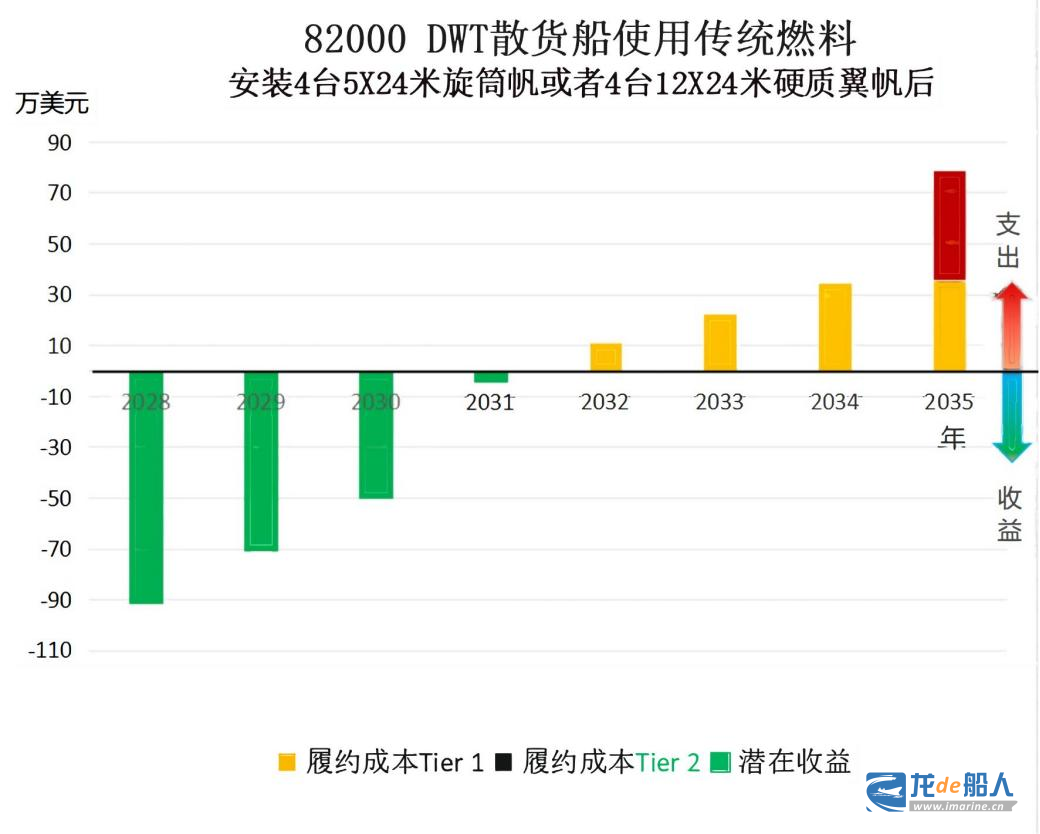 如8.2 万DWT散货船的货舱区安装4台5米X24米旋筒帆或4台12米X24米硬质翼帆,预计为船舶提供的辅助推进有效功率约为1860kW,为船舶带来的节油效果约为27%。安装风力辅助推进系统后的船舶在满足新规下为船舶带来的收益如下图所示: