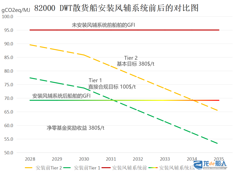 以一艘使用燃油燃料的8.2万吨散货船为例,该船在2028年后若未采取减排措施,其GFI超过基线目标93.3 gCO₂eq/MJ,需按碳价购买“补救单位(RU)”以抵消超额排放。然而,若该船安装转子帆或硬质翼帆系统,风力辅助推进可替代约10%-30%的传统燃料消耗。根据GFI公式: