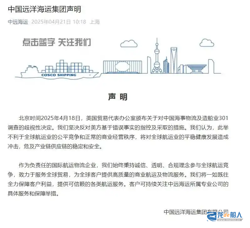 4月21日,中国远洋海运集团发布声明,北京时间2025年4月18日,美国贸易代表办公室颁布关于对中国海事物流及造船业301调查的歧视性决定。中远海运坚决反对美方基于错误事实的指控及采取的措施。中远海运认为,此举不利于全球航运业的公平竞争和正常的商业经营秩序,将对全球航运业的平稳健康发展造成冲击,危及产业链供应链的稳定和安全。