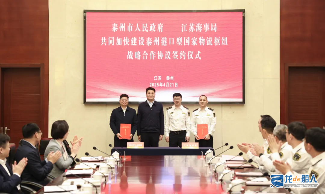 4月21日,江苏海事局与泰州市人民政府在泰州签署共同加快建设泰州港口型国家物流枢纽战略合作协议。江苏海事局党组书记、局长缪昌文,泰州市委书记姜冬冬出席活动并讲话。江苏海事局党组成员、副局长黄燕品代表江苏海事局发布支持泰州建设港口型国家物流枢纽若干措施,并与泰州市委常委、副市长秦猛分别代表双方签署战略合作协议。