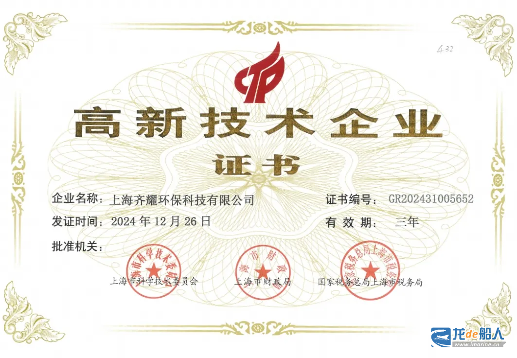 近日,中船集团下属上海齐耀环保科技有限公司(以下简称“齐耀环保”)再次获上海市高新技术企业认定,标志着齐耀环保的研发实力、创新能力和产业转化水平获得认可,进一步彰显了齐耀环保在船用环保装备领域的技术创新优势和行业引领作用。