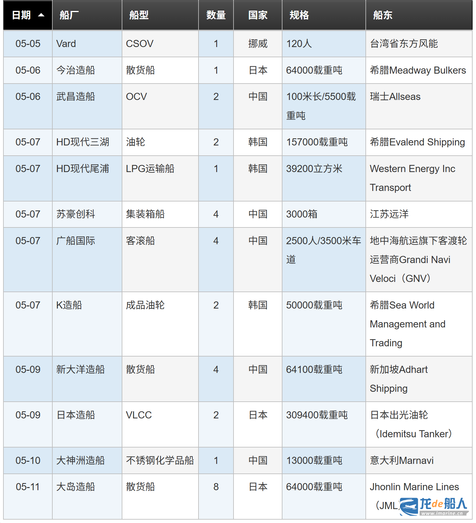船厂订单汇总(5.5-5.11):上周32艘