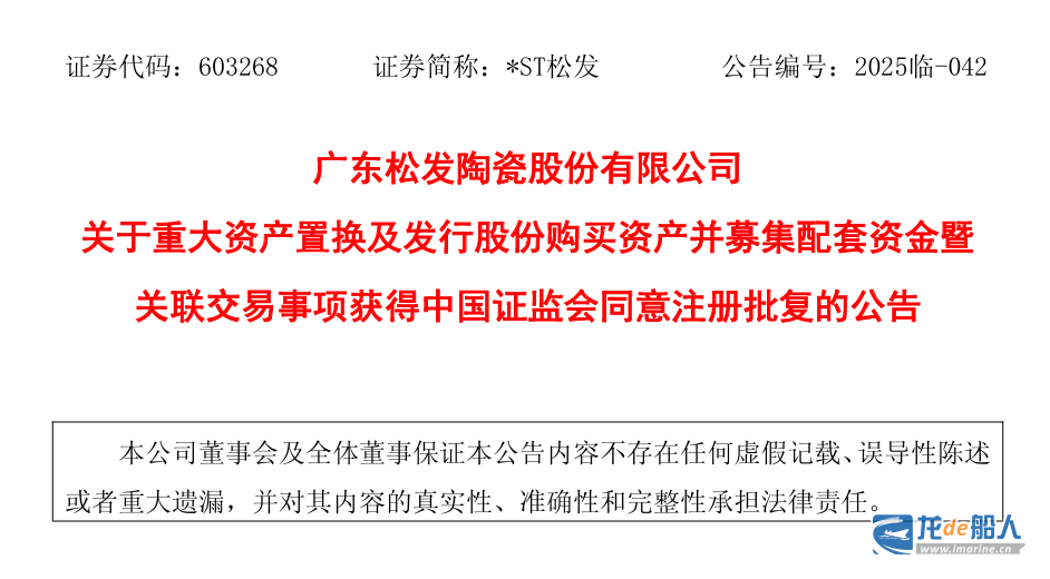 5月16日晚间,广东松发陶瓷股份有限公司(*ST松发)发布公告, 已收到中国证券监督管理委员会出具的《关于同意广东松发陶瓷股份有限公司发行股份购买资产并募集配套资金注册的批复》。该批复的取得,标志着民营船厂恒力重工在A股上市进程中获得关键进展。