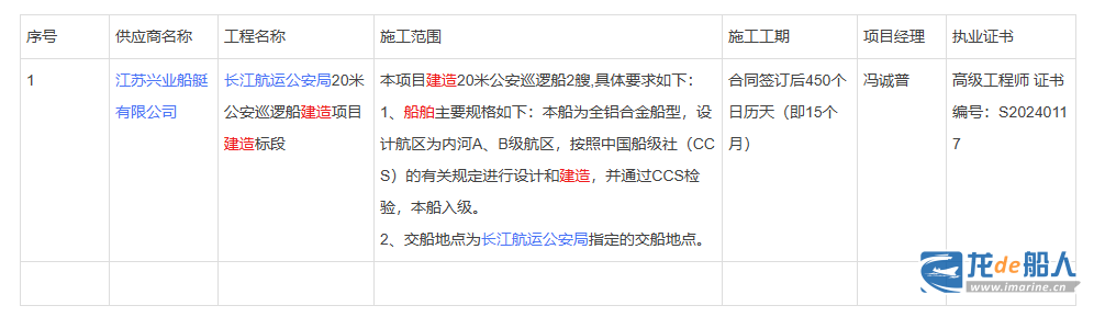 长江航运公安局20米公安巡逻船建造项目建造标段中标公告