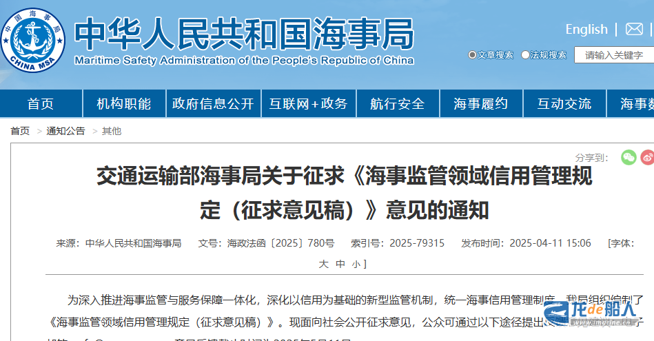 据中国海事消息,为深入推进海事监管与服务保障一体化,深化以信用为基础的新型监管机制,统一海事信用管理制度,中国海事局组织编制了《海事监管领域信用管理规定(征求意见稿)》。