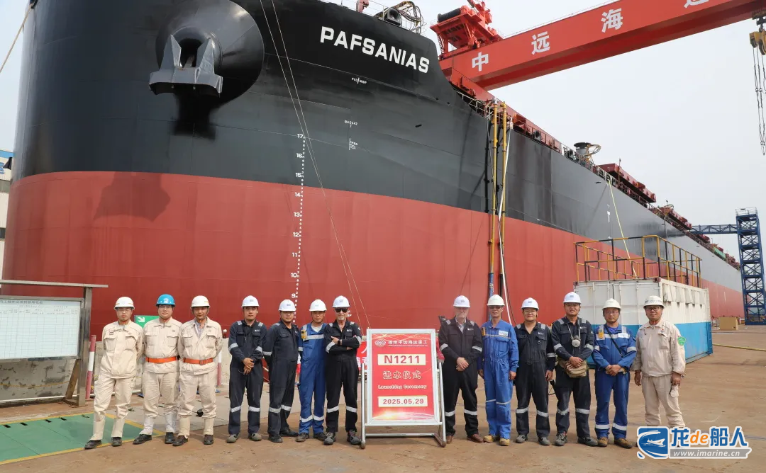 5月29日,扬州中远海运重工为希腊船东Laskaridis Shipping 公司建造的8.25万吨散货船系列首制船(船体号:N1211)按预定计划顺利完成出坞。
