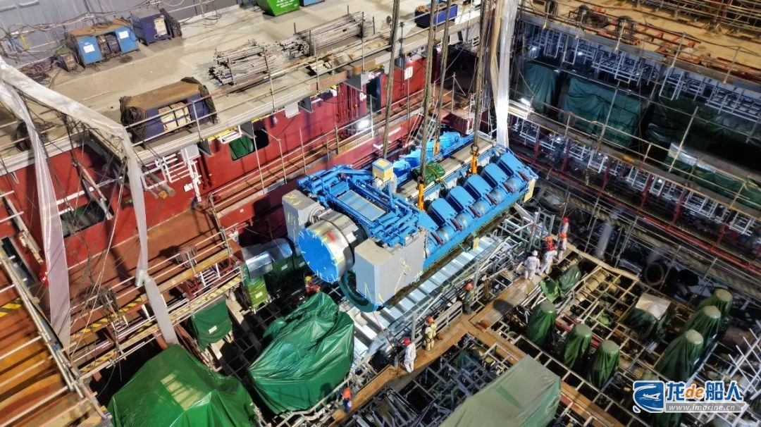 “浚广”是国内首创首造、亚洲最大的耙吸式挖泥船,是中国疏浚装备巨型耙吸船发展的战略性“母型船”,也是该等级耙吸船的首制船舶。此次吊装的主机作为船舶的“心脏”,是整船动力系统的核心,其单台重量达223吨,安装精度要求极高。主机吊装涉及结构强度、轴系对中、管路接驳等多维度技术要求,在生产现场,搭载着主机的起重设备缓缓升起,经过2小时的精密操作,主机最终以毫米级误差平稳落座于船体基座。