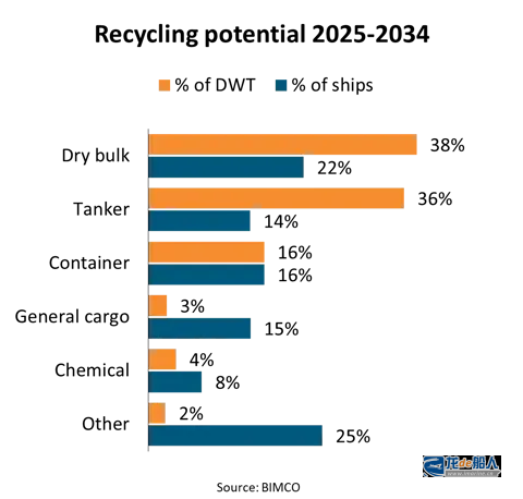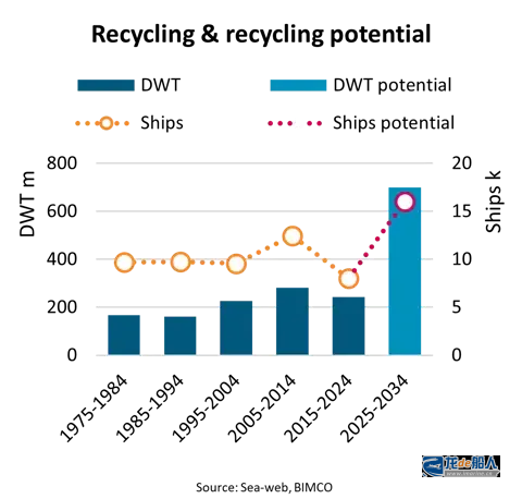 事实上,2000年代建造的船舶目前仅有3%(按数量计)和5%(按载重吨计)已被拆解;而1990年代建造的船舶已有20%(按数量计)和67%(按载重吨计)完成拆解。