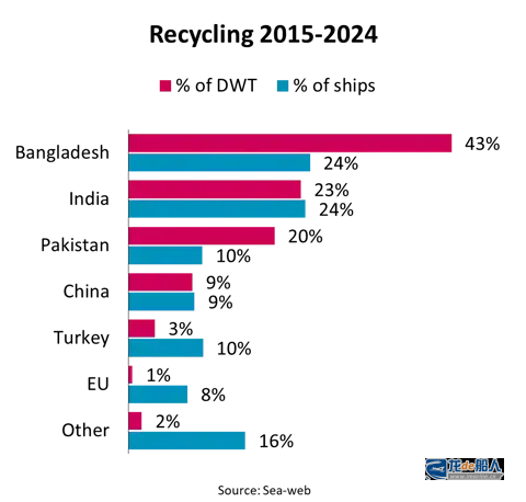 在2015至2024年间,孟加拉国、印度和巴基斯坦仍是全球最大的船舶拆解地,其拆解量占全球拆解载重吨的86%、拆解船舶数量的58%。自2017年起中国停止拆解国际船舶、拆解量降至不足全球拆解载重吨的2%后,前述三国的主导地位已进一步提升。