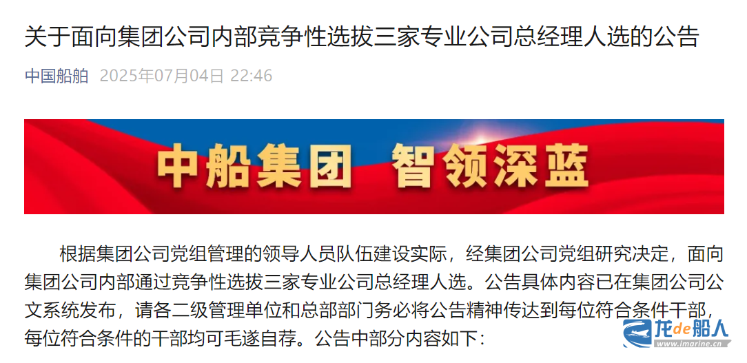 7月4日,中国船舶集团(以下简称“集团公司”)在官微发布《关于面向集团公司内部竞争性选拔三家专业公司总经理人选的公告》。