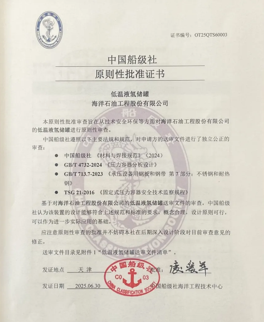 近日,海油工程特种设备分公司自主研发的深远海浮式平台“低温液氢储罐”设计成果获中国船级社(CCS)原则性批准(AIP)证书,标志着该成果的安全性与可靠性已全面符合船级社规范要求,为我国深远海氢能开发关键装备制造奠定坚实基础。