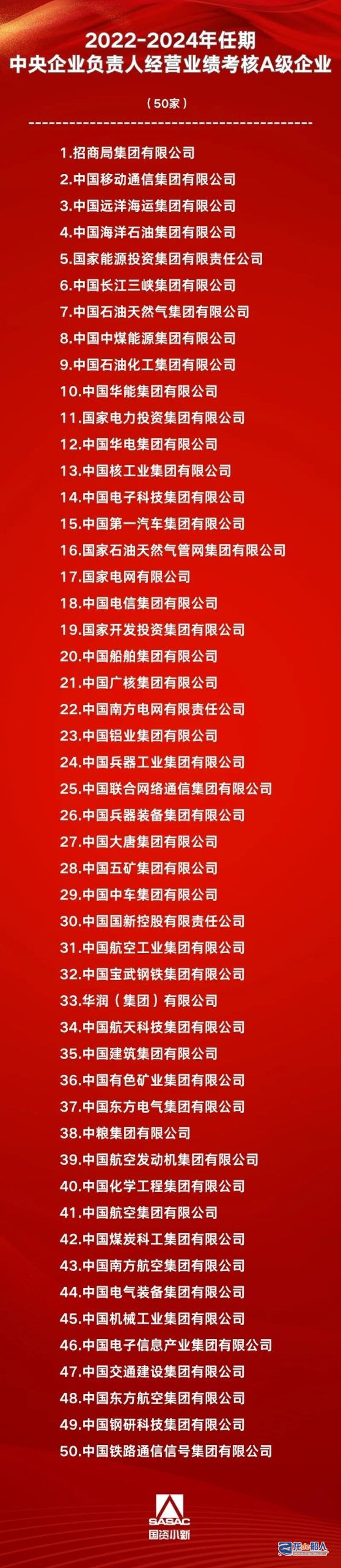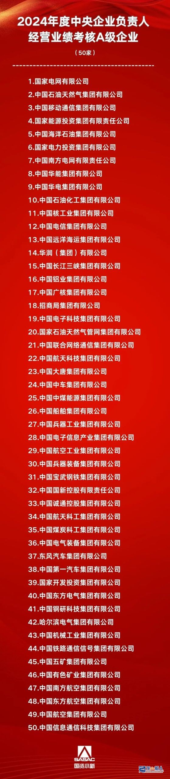 2024年度和2022-2024年任期中央企业负责人经营业绩考核A级企业完整名单如下: