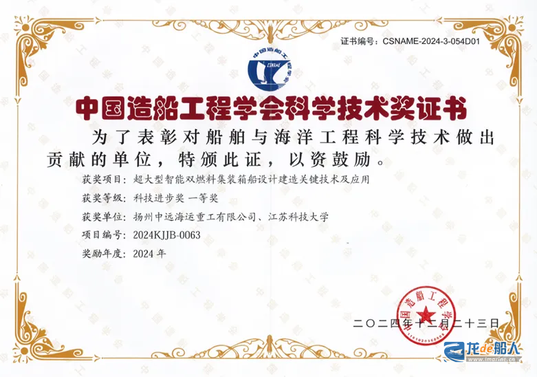 近日,中国造船工程学会第十次会员代表在青岛隆重举行。会议期间,发布了2024年度科学技术奖评审结果,由扬州中远海运重工牵头的《超大型智能双燃料集装箱船设计建造关键技术及应用》获科技进步一等奖。