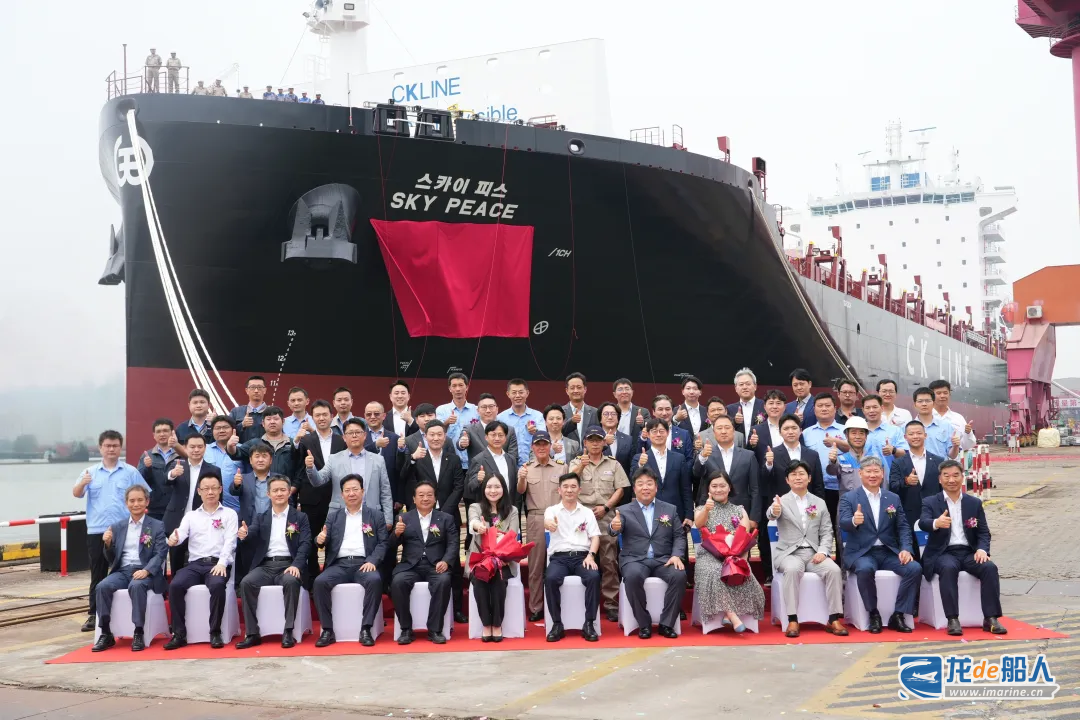 据了解,“SKY PEACE”轮是中船贸易/黄埔文冲为CK Line建造的2艘系列集装箱船的首制船,于同日交付。该系列船由上海船舶研究设计院设计,船型总长188.8米,型宽32.2米,型深17.1m,约34900载重吨,入级KR船级社,具有载重量大、油耗低、经济性好的优势,震动和噪声要求满足最新规范,能够满足船东的航运需求。