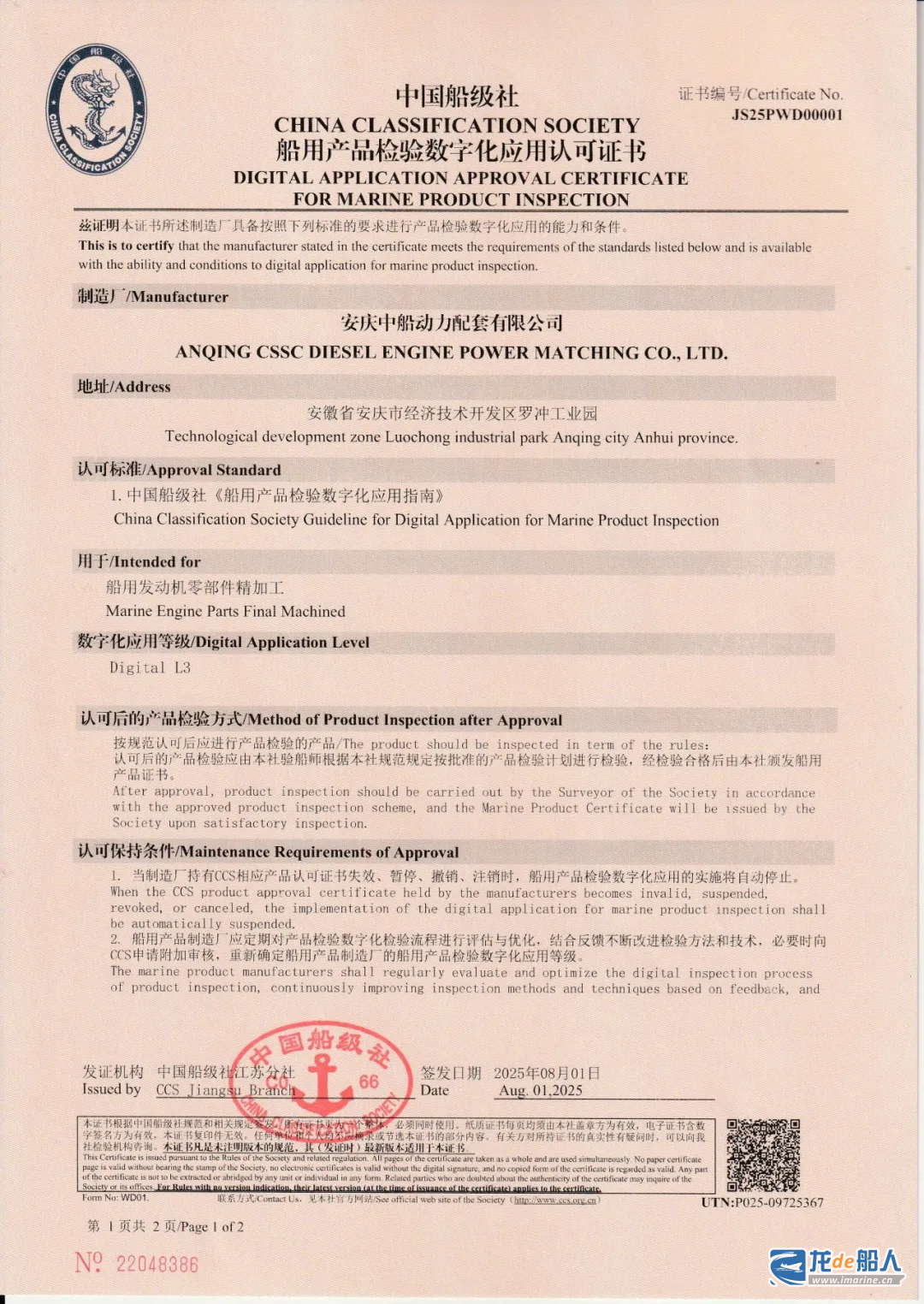 8月5日,中国船级社江苏分社总经理庄重、副总经理衡霖在南京向中船动力所属中船安柴下属动力配套颁发首张产品检验数字化应用L3级工厂认可证书。该证书满足中国船级社2025年7月1日发布的《船用产品检验数字化应用指南》中船用零部件制造企业最高级(L3级)要求,标志着动力配套数字化检验能力达到船用零部件制造行业领先水平。