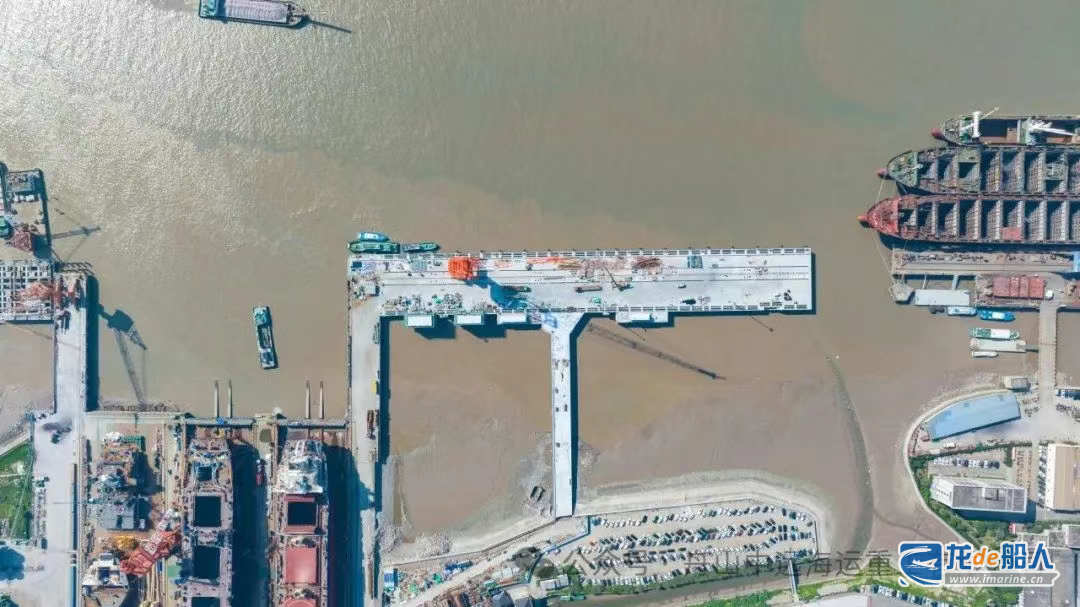 九号码头工程于2024年9月30日正式开工建设,泊位总长度357.6米,其中码头平台长302米(包含已建船台21米),宽40米,设计最大可承接150,000载重吨(DWT)船舶的舾装作业。工程主要建设内容包括新建码头平台(含3#引桥)、管道与设备安装、轨道式起重装卸设备安装以及相应的舾装配套设施等。