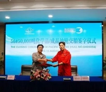 8月15日上午,56#50000吨Ⅱ类化学品船完工交付仪式在新时代造船办公楼八楼会议室举行,新时代造船常务副总经理张玉永、副总经理袁衡与新加坡船东EPS代表倪杰等参加仪式,共同见证船舶交付。