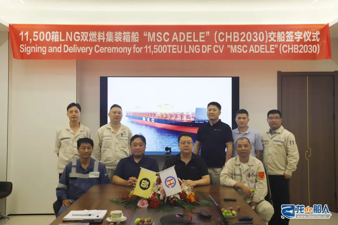 同日下午,舟山长宏国际为地中海航运(MSC)建造的第4艘11500箱LNG双燃料集装箱船(CHB2030)通过视频连线方式成功签字交付,较合同交期提前74天。