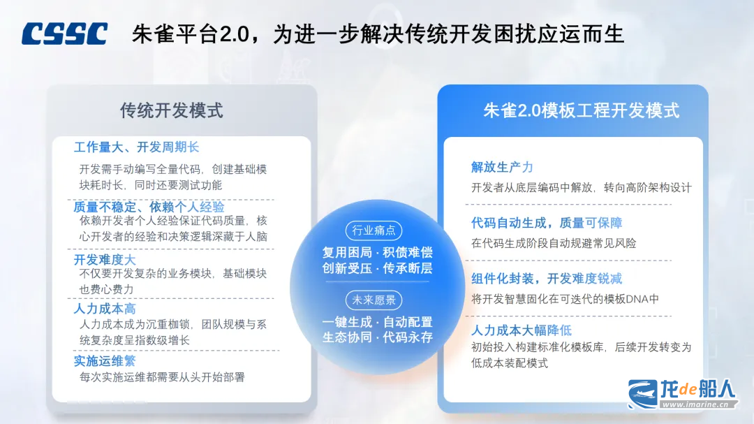 朱雀平台是十一所自主研发的船舶行业信息化管理软件统一开发平台,其2.0版本是在1.0基础上实现革命性升级,通过前后端代码自动生成技术,将MES/MOM系统、设备监控平台等核心工业软件的开发效率提升50%-80%,人力成本降低近50%。尤为突出的是平台大幅降低开发门槛,使无经验人员也能在十几分钟内完成简单系统搭建。作为十一所信息化管理软件统一开发的“数字基石”,朱雀2.0已成功应用于涂装能源管理系统、工时管理系统、劳动力管理系统、总组搭载平台重构以及全宽总段系统等五大系统,其标准化模板和模块化架构,不仅满足船舶制造多品种、小批量的特殊需求,更将为支撑中船集团数字化转型提供统一的技术标准。