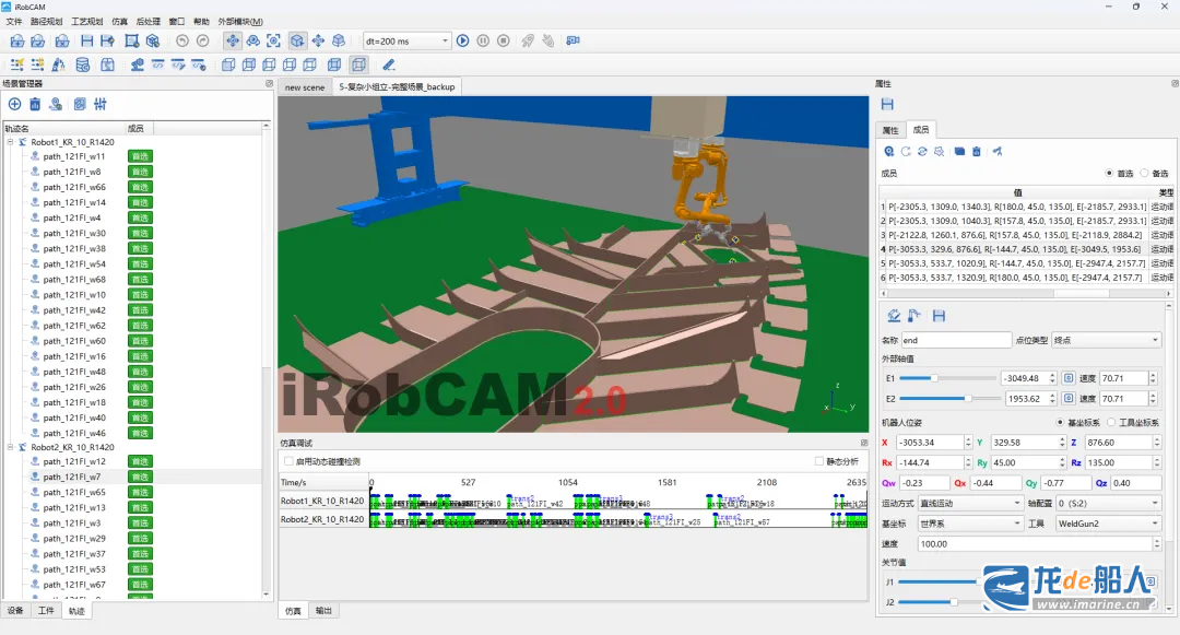 船舶机器人工艺规划与仿真软件iRobCAM是十一所面向船舶智能工艺装备应用需求,自主研发的船舶机器人工艺规划与仿真软件。iRobCAM2.0版本是在1.0基础上突破复杂轨迹规划、智能视觉传感、装备智能控制三大技术瓶颈,支持基于视觉/模型的双模式智能编程,支持带角度平焊缝、圆弧焊缝的路径规划,新增KUKA、节卡等品牌机器人适配能力,构建iRobSYS通用操作系统,实现传感控制、焊缝识别、运动规划、控制执行的一体化集成。作为船舶智能工艺装备的“核心大脑”,iRobCAM2.0已成功应用于小组立焊接、型材/条材切割、中组立狭小空间焊接等典型场景,在黄埔文冲、沪东中华、宜昌达门等船海企业实现工程应用,助力我国船舶制造智能化、数字化转型。
