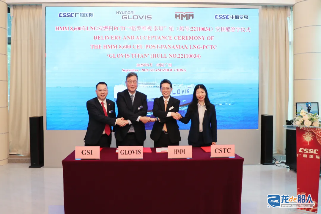 9月9日,中船集团广船国际联合中船贸易为韩国HMM(韩新海运)航运公司建造的8600车汽车运输船1号船较合同期大幅提前命名交付,该船被命名为“GLOVIS TITAN(格罗维视 泰坦)”号。