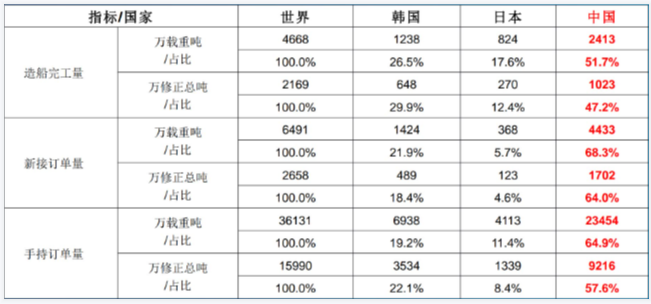 上半年,我国造船完工量、新接订单量、手持订单量以载重吨计分别占世界总量的51.7%、68.3%和64.9%,以修正总吨计分别占世界总量的47.2%,64.0%和57.6%,继续保持全球领先。骨干船企国际竞争力不断增强,分别有6家、6家和6家企业位居世界造船完工量、新接订单量和手持订单量前10强。