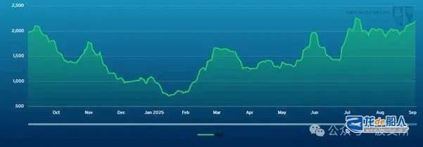 自8月初以来,我们看到FBX01(中国/东亚–美国西岸)从8月初的高点2,369美元降至8月底的低点1,728美元,并在整个9月维持在2,000美元低位区间,今日报2,295美元。FBX03(中国/东亚–美国东岸)在同期也呈现类似走势,8月初运价为3,705美元,今日为3,630美元,8月底曾跌至2,703美元的低点。