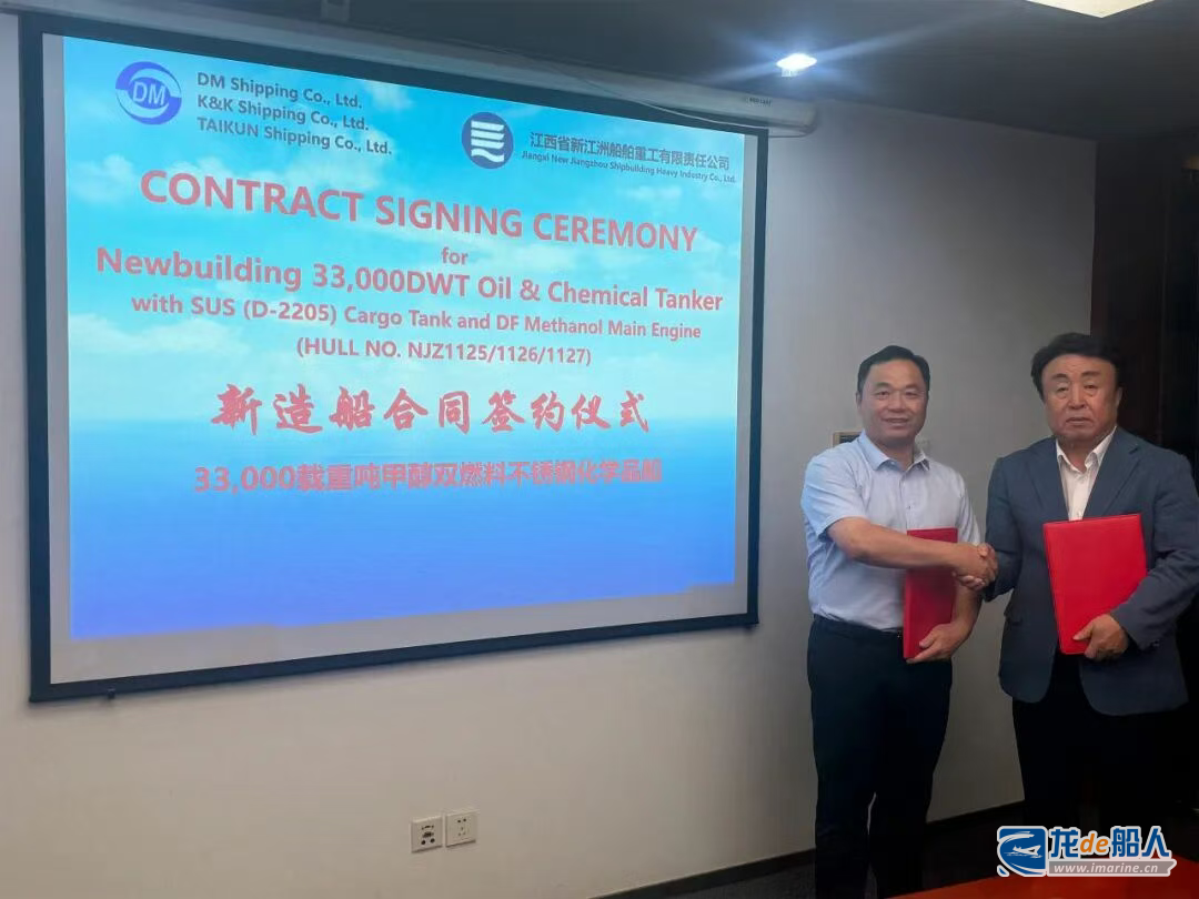 近日,江西省新江洲船舶重工有限责任公司(以下简称“新江洲”)收到韩国最大的化学品航运公司DM SHIPPING CO.,LTD.(以下简称“DM SHIPPING”)董事会决议邮件,标志着“新江洲”与“DM SHIPPING”签署的33000吨甲醇双燃料双相不锈钢化学品船建造合同获得双方董事会批准,该建造合同由新江洲船舶重工总经理吴秋平与 DM SHIPPING 公司副总裁J.K.SONG 在上海共同签署。