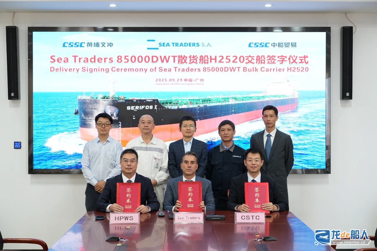 9月29日,中船黄埔文冲船舶有限公司联合中国船舶工业贸易有限公司 (CSTC) 为希腊船王George J. Procopiou旗下散货船公司Sea Traders建造的“海鲸”85000DWT散货船首制船“SERIFOS I”,在该公司龙穴厂区正式命名交付。
