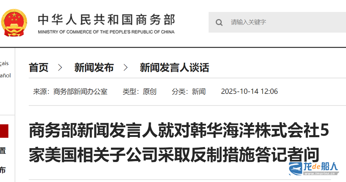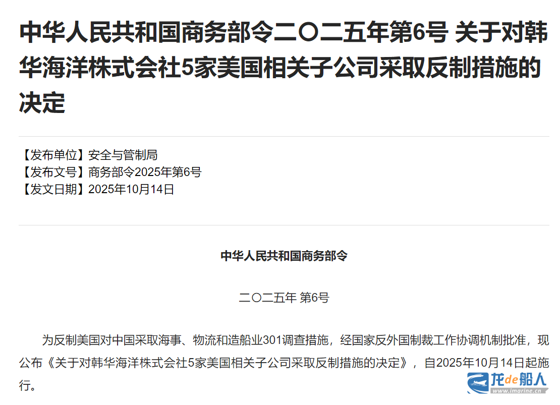 为反制美国对中国采取海事、物流和造船业301调查措施,10月14日,商务部宣布对韩华海洋株式会社5家美国相关子公司采取反制措施,自2025年10月14日起施行。