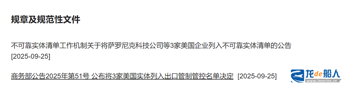 9月25日,商务部在宣布将3家美国企业列入不可靠实体清单,将3家美国实体列入出口管制管控名单,其中包括3家涉船企业:亨廷顿·英格尔斯工业公司、萨罗尼克科技公司、国际海洋工程公司。