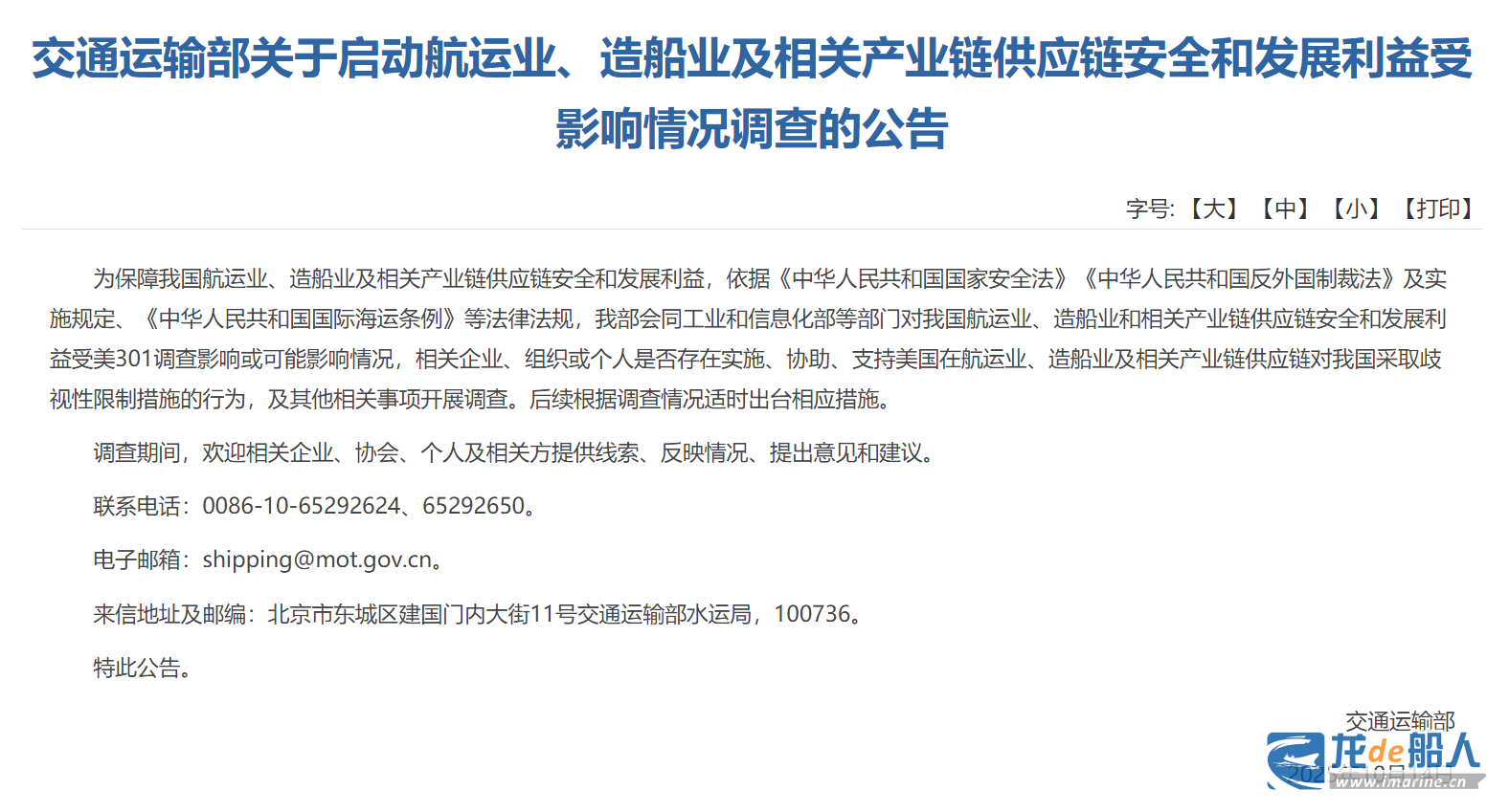 根据公告,为保障我国航运业、造船业及相关产业链供应链安全和发展利益,依据《中华人民共和国国家安全法》《中华人民共和国反外国制裁法》及实施规定、《中华人民共和国国际海运条例》等法律法规,交通运输部会同工业和信息化部等部门对我国航运业、造船业和相关产业链供应链安全和发展利益受美301调查影响或可能影响情况,相关企业、组织或个人是否存在实施、协助、支持美国在航运业、造船业及相关产业链供应链对我国采取歧视性限制措施的行为,及其他相关事项开展调查。后续根据调查情况适时出台相应措施。