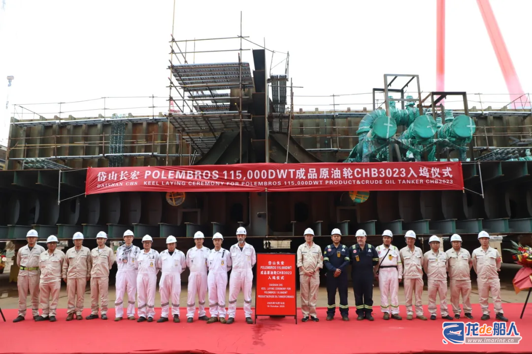 10月16号,舟山长宏国际为希腊Polembros Shipping公司建造的11.5万吨油轮(CHB3023)在岱山长宏造船基地一号坞顺利入坞铺龙骨,正式开启坞内搭载新阶段。