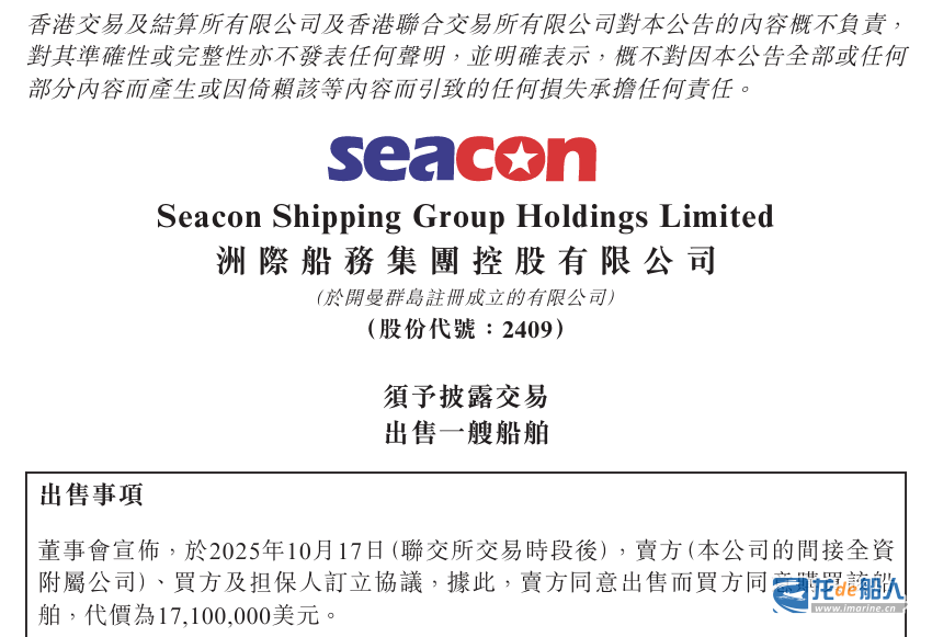 10月19日,洲际船务集团控股有限公司(以下简称“洲际船务”)发布《须予披露交易出售一艘船舶》的公告。