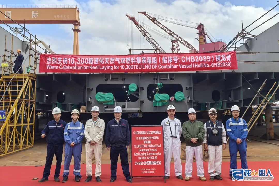 10月24日,舟山长宏国际为MSC建造的第3艘10300箱LNG双燃料集装箱船(CHB2039)在1号船台完成铺龙骨仪式,标志着该系列船舶的建造工程正式转入坞内搭载关键阶段,为项目后续顺利推进奠定了坚实基础。