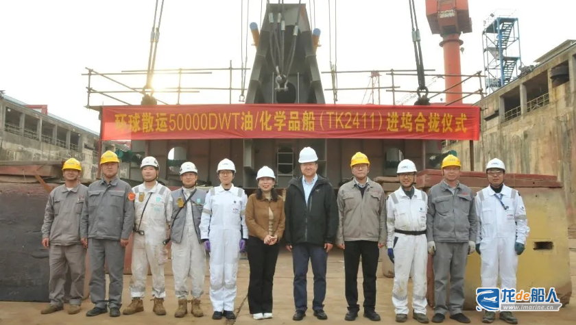 10月27日,环球散运订造的50000DWT油/化学品船(TK2411)进坞合拢。该型船总长182.75 米,型宽32.20米,型深19.10米,设计吃水11.00米,设计航速14.5节,入级LR。