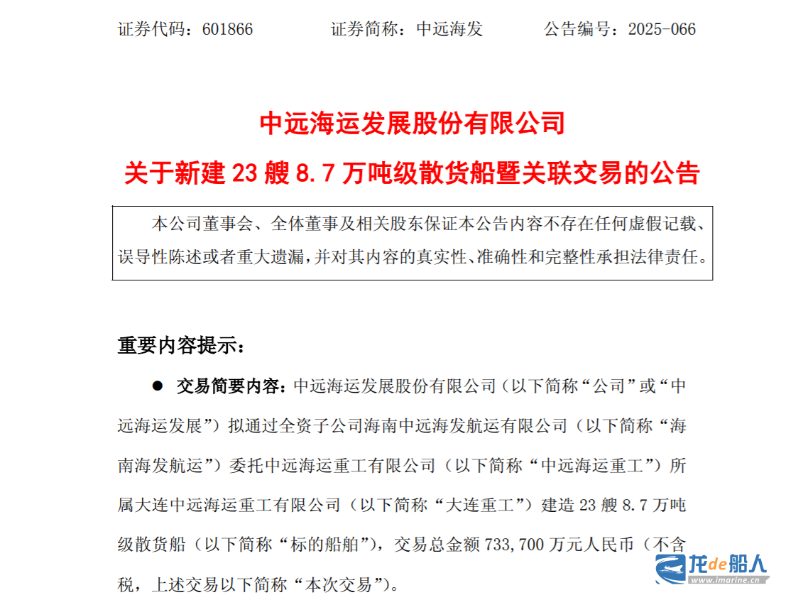 根据中远海发披露的《关于新建23艘8.7万吨级散货船暨关联交易》的公告,中远海发拟通过全资子公司海南中远海发航运有限公司(海南海发航运)委托中远海运重工有限公司(中远海运重工)所属大连中远海运重工有限公司(大连中远海运重工)建造23艘8.7万吨级散货船,交易总金额733700万元(不含税),单船船价为31900万元(不含税),预计首船2027年5月20日或更早的时间交付,其他陆续于2028年底前交付。