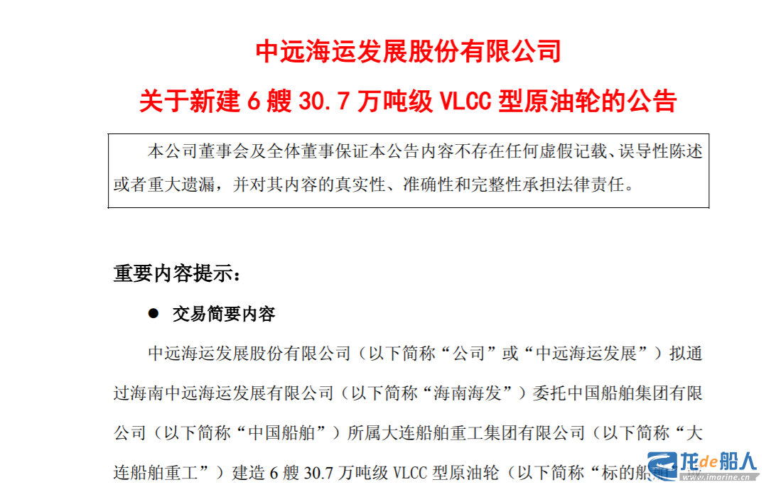根据中远海发披露的《关于新建6艘30.7万吨级VLCC型原油轮》的公告,中远海发拟通过海南中远海运发展有限公司(海南海发)委托中国船舶集团有限公司所属大连船舶重工集团有限公司(大连造船)建造6艘30.7万吨级 VLCC 型原油轮,交易总金额508680万元(不含税),双方议定的单船船价为84780万元。