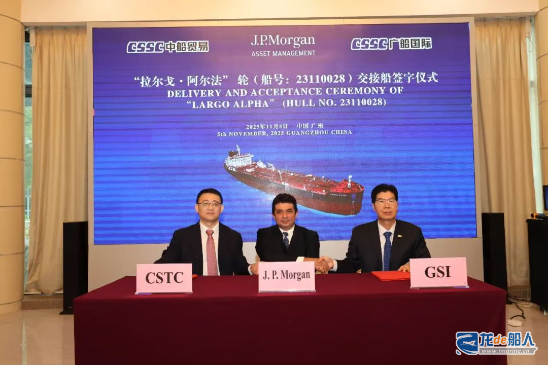 广船国际联合中船贸易为J.P.Morgan Asset Management公司建造4.95万吨甲醇双燃料化学品/成品油船3号船“拉尔戈·阿尔法”号提前完工交付。
