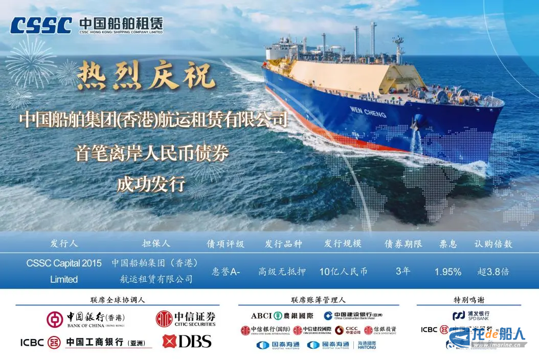 11月5日,中国船舶集团(香港)航运租赁有限公司在香港联合交易所成功发行三年期10亿元人民币境外高级无抵押固息债券。本次债券在中船租赁30亿美元境外中期票据计划框架下发行,是该公司首单离岸人民币债券,标志着该公司在国际资本市场的融资能力与平台建设再进一步。