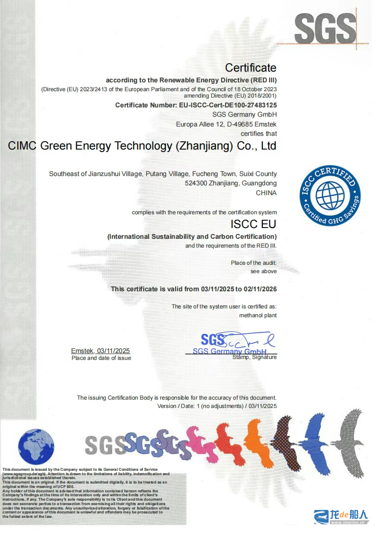 本次顺利取证意味着中集安瑞科的绿色甲醇产品完全符合REDIII法规及欧盟ISCC的可持续认证规则要求(覆盖产品全生命周期),获得了融入全球可再生燃料供应生态链的“通行证”。这也是华南地区首个获得ISCC EU认证的生物甲醇项目。