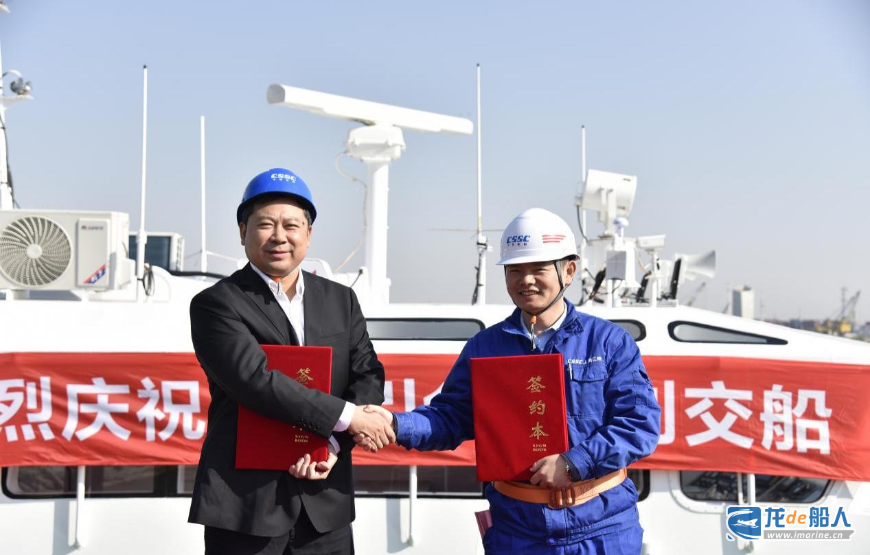 仪式上,江苏海畅船舶服务有限公司总经理杭建军与上海东真船舶工程有限公司副总经理金国林签署交船文件。