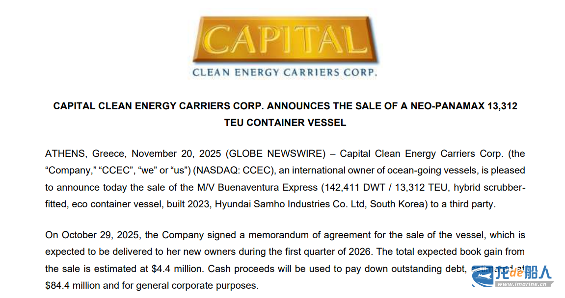 11月20日,CCEC通过官网宣布,该公司已同意将13312TEU大型集装箱船“M/V Buenaventura Express”号出售给第三方,预计将于2026年第一季度交付新船东,船舶出售意向备忘录已于2025年10月29日签署。