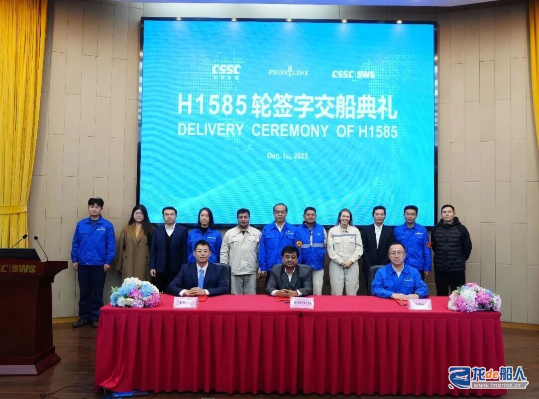 12月1日,中国船舶集团旗下上海外高桥造船有限公司为挪威Frontline公司建造的15.8万吨苏伊士型原油轮“SEA POLARIS(海洋北极星)”轮正式签字交付,为该公司全年交船任务画上了圆满句号。至此,2025年公司顺利交付29艘船舶,累计270.65万载重吨,以超额完成7艘的优异成绩交出了一份亮眼的答卷。交付船型涵盖11.4万吨阿芙拉型成品油轮19艘(含1艘全球首艘风帆助推型)、15.8万吨苏伊士型原油轮2艘、汽车运输船(PCTC)7艘,以及7000TEU集装箱船1艘,在中国船舶工业的高质量发展征程上,刻下了属于外高桥造船的卓越印记。