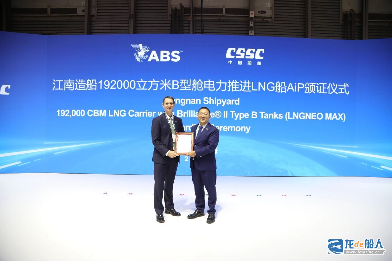 发布仪式上,江南造船副总经理林青山进行了该船型产品的介绍,美国船级社(ABS)向江南造船总经理肖文林正式颁发19.2万立方米B型舱电力推进LNG船船型设计的原则性认可(AiP)证书。